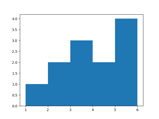 import matplotlib.pyplot as plt data = [1,2,2,3,3,3,4,4,5,5,5,6] plt.hist(data, bins=5) plt.show() # Output: # Histogram with 5 bins -