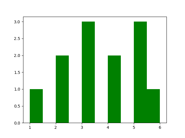 import matplotlib.pyplot as plt data = [1,2,2,3,3,3,4,4,5,5,5,6] plt.hist(data, color="green") plt.show() # Output: # Green colored histogram bars