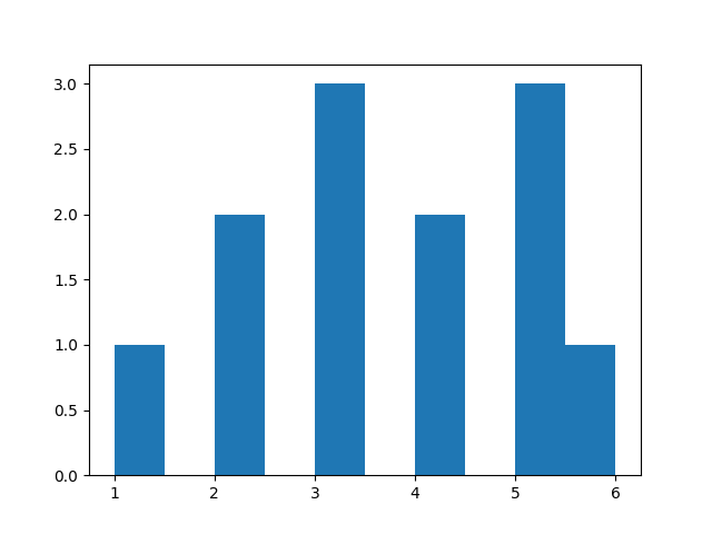 import matplotlib.pyplot as plt data = [1,2,2,3,3,3,4,4,5,5,5,6] plt.hist(data) plt.show() # Output: # Histogram showing frequency distribution