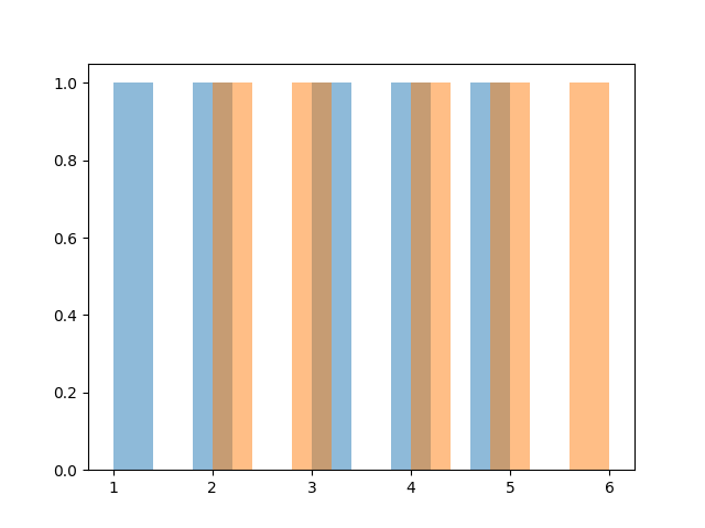 import matplotlib.pyplot as plt data1 = [1,2,3,4,5] data2 = [2,3,4,5,6] plt.hist(data1, alpha=0.5) plt.hist(data2, alpha=0.5) plt.show() # Output: # Two overlapping histograms alpha controls transparency.