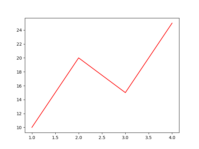 import matplotlib.pyplot as plt x = [1, 2, 3, 4] y = [10, 20, 15, 25] plt.plot(x, y, color="red") plt.show() # Output: # Red colored line plot You can use colors like "blue", "green", "black", etc.