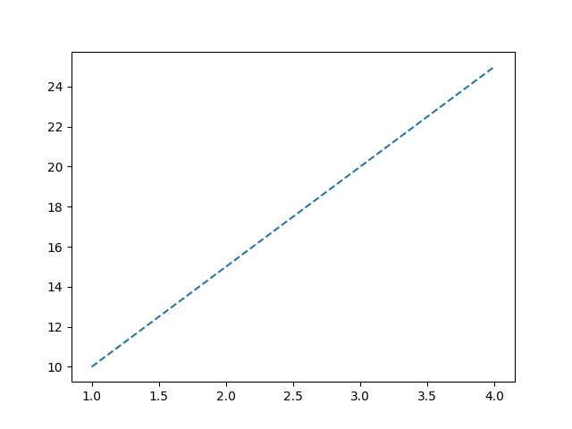 import matplotlib.pyplot as plt x = [1, 2, 3, 4] y = [10, 20, 15, 25] plt.plot(x, y, linestyle="--") plt.show() # Output: # Dashed line plot