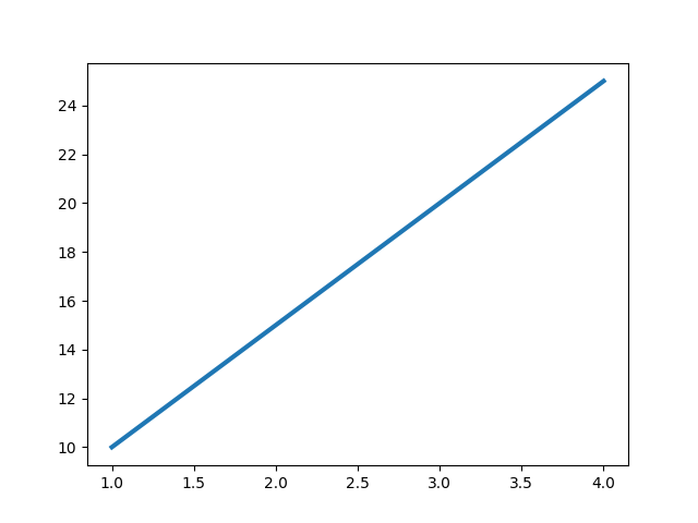 import matplotlib.pyplot as plt x = [1, 2, 3, 4] y = [10, 20, 15, 25] plt.plot(x, y, linewidth=3) plt.show() # Output: # Thicker line plot