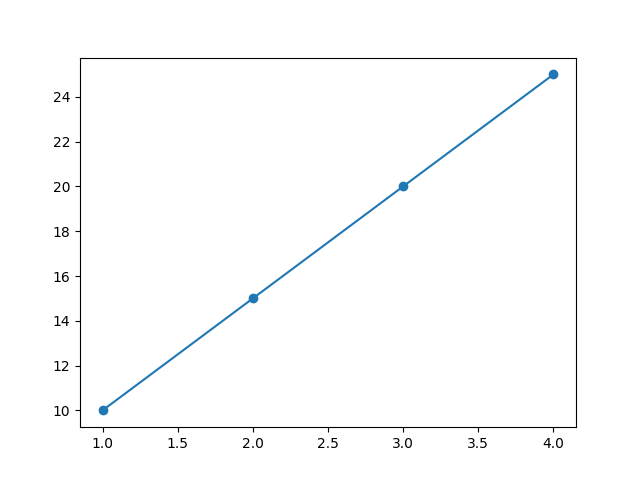 import matplotlib.pyplot as plt x = [1, 2, 3, 4] y = [10, 20, 15, 25] plt.plot(x, y) plt.show() # Output: # A simple line chart connecting the points