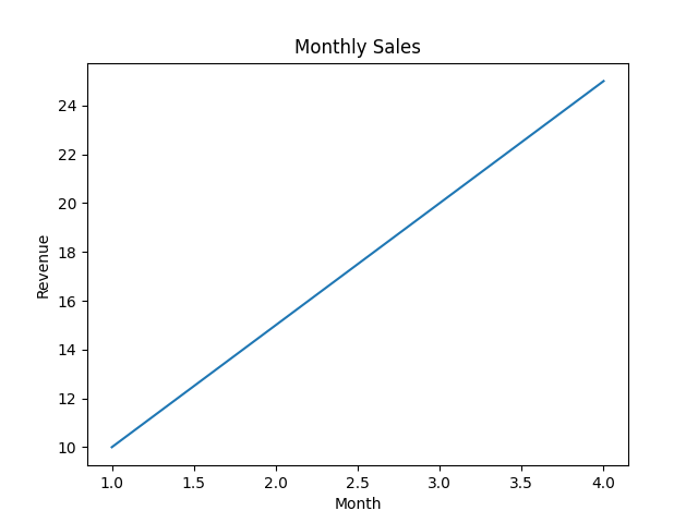 import matplotlib.pyplot as plt x = [1, 2, 3, 4] y = [10, 20, 15, 25] plt.plot(x, y) plt.title("Monthly Sales") plt.xlabel("Month") plt.ylabel("Revenue") plt.show() # Output: # Line chart with title and axis labels