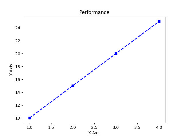 import matplotlib.pyplot as plt x = [1, 2, 3, 4] y = [10, 20, 15, 25] plt.plot(x, y, color="blue", linestyle="--", linewidth=2, marker="s") plt.title("Performance") plt.xlabel("X Axis") plt.ylabel("Y Axis") plt.show() # Output: # Styled line plot with square markers and dashed blue line
