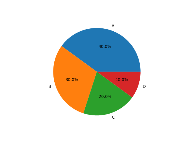 import matplotlib.pyplot as plt values = [40, 30, 20, 10] labels = ["A", "B", "C", "D"]plt.pie(values, labels=labels, autopct="%1.1f%%") plt.show() # Output: # Pie chart with percentage values