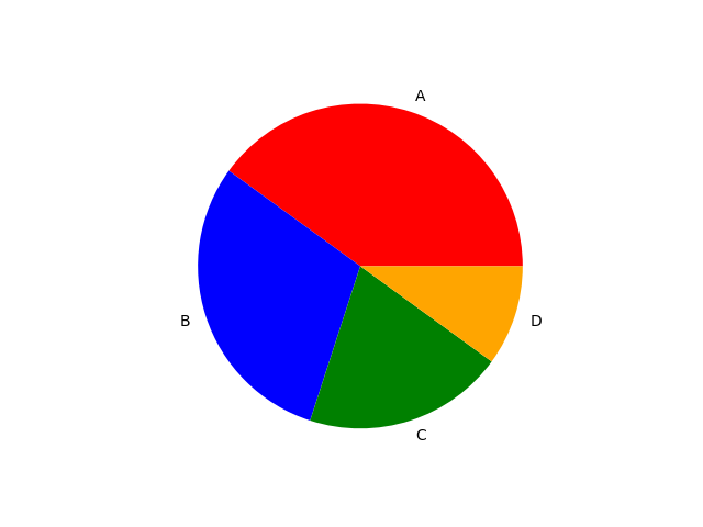 import matplotlib.pyplot as plt values = [40, 30, 20, 10]labels = ["A", "B", "C", "D"]colors = ["red", "blue", "green", "orange"] plt.pie(values, labels=labels, colors=colors) plt.show() # Output: # Pie chart with custom colors