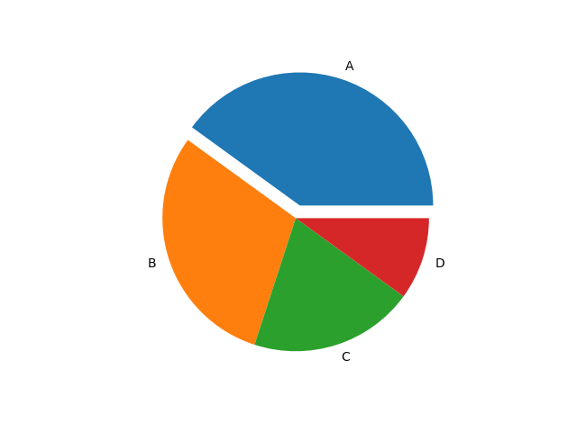 import matplotlib.pyplot as plt values = [40, 30, 20, 10]labels = ["A", "B", "C", "D"]explode = [0.1, 0, 0, 0] plt.pie(values, labels=labels, explode=explode) plt.show() # Output: # First slice slightly separated from the pie