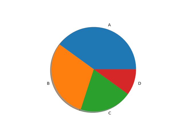 import matplotlib.pyplot as plt values = [40, 30, 20, 10]labels = ["A", "B", "C", "D"]plt.pie(values, labels=labels, shadow=True) plt.show() # Output: # Pie chart with shadow effect