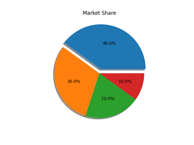 import matplotlib.pyplot as plt values = [40, 30, 20, 10] labels = ["A", "B", "C", "D"] plt.pie(values, labels=labels, colors=colors, autopct="%1.1f%%", explode=explode, shadow=True) plt.title("Market Share") plt.show() # Output: # Fully styled pie chart