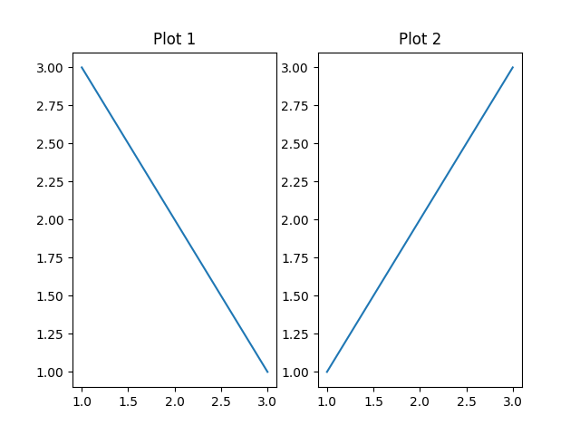 import matplotlib.pyplot as plt plt.subplot(1, 2, 1) plt.plot([1, 2, 3], [3, 2, 1]) plt.title("Plot 1") plt.subplot(1, 2, 2) plt.plot([1, 2, 3], [1, 2, 3]) plt.title("Plot 2") plt.show() # Output: # Two line charts displayed side by side