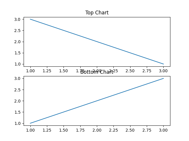 import matplotlib.pyplot as plt fig, ax = plt.subplots(2, 1) ax[0].plot([1,2,3], [3,2,1]) ax[0].set_title("Top Chart") ax[1].plot([1,2,3], [1,2,3]) ax[1].set_title("Bottom Chart") plt.show() # Output: # Two stacked charts vertically