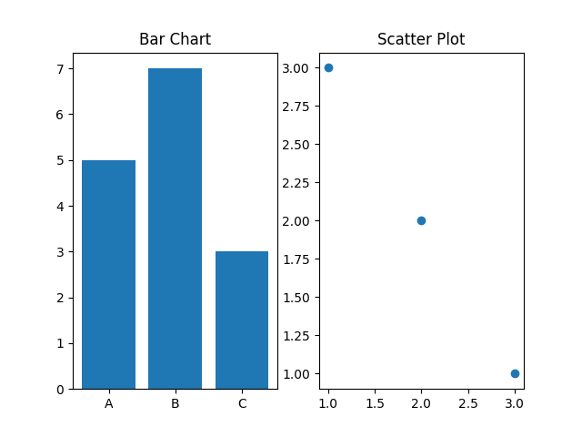 import matplotlib.pyplot as plt fig, ax = plt.subplots(1, 2) ax[0].bar(["A","B","C"], [5,7,3]) ax[0].set_title("Bar Chart") ax[1].scatter([1,2,3], [3,2,1]) ax[1].set_title("Scatter Plot") plt.show() # Output: # Bar chart and scatter plot side by side